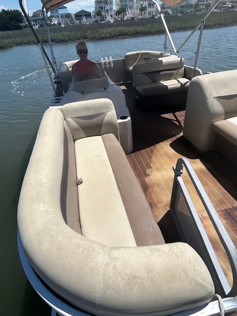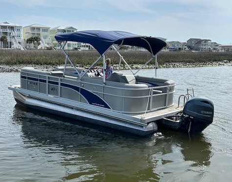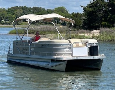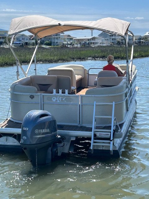 We name all our boats by colors and this is "Gold". This 23' pontoon boat, is rated for up to 12 passengers with tons of room and very comfortable couch style seating. THIS IS NOT A SPEED BOAT: You are renting this boat for the casual cruising, not getting from point A to point B as quickly as possible. The boat is set to cruise at 10-20mph and speed will vary depending upon the amount of weight added (people, coolers etc...). The boat is equipped with wrap around seating, drink holders, anchor and safety equipment as required by NC law. Gold is a great boat for cruising the waterway with family and friends.