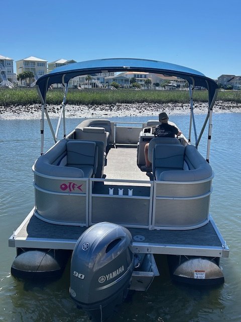 We name all our boats by colors and this is "Pink". This 22' pontoon boat is rated for up to 12 passengers with tons of room and very comfortable couch style seating. THIS IS NOT A SPEED BOAT: You are renting this boat for the casual cruising, not getting from point A to point B as quickly as possible. The boat is set to cruise at 10-20mph and speed will vary depending upon the amount of weight added (people, coolers etc...). The boat is equipped with wrap around seating, drink holders, anchor and safety equipment as required by NC law. Pink is a great boat for cruising the waterway with family and friends.